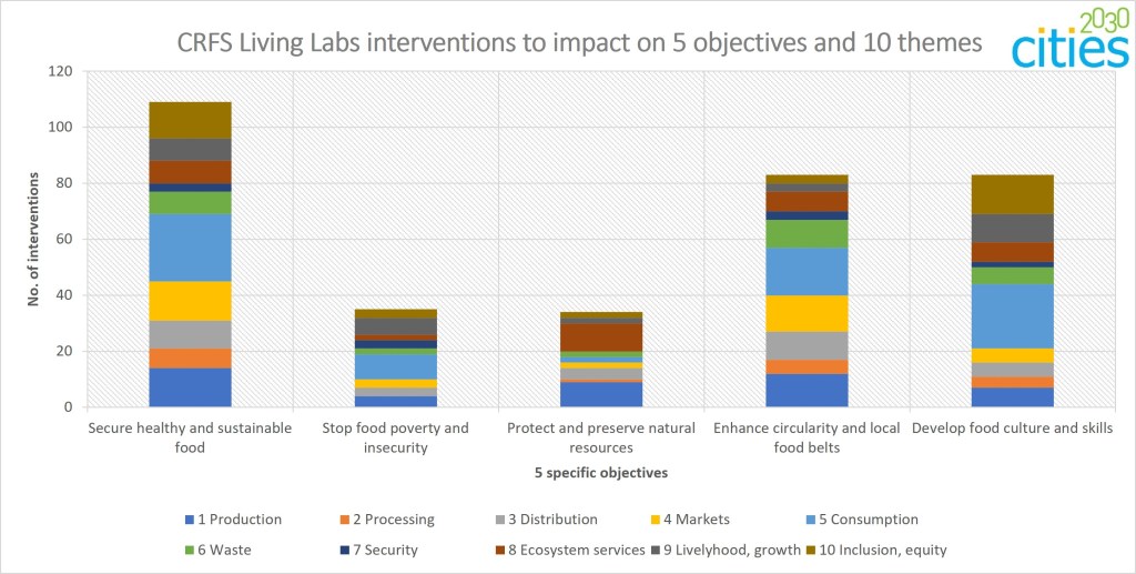 Cities2030 has mobilised 18 Living Labs to carry out innovation actions. The interventions are addressed to transform city region food systems (10 themes) and achieve the 5 specific objectives.