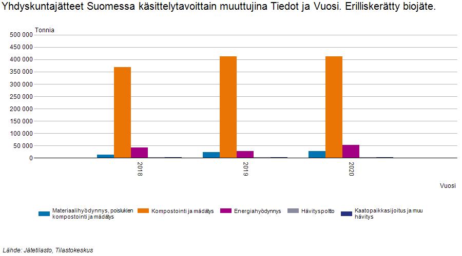Suomen Tilastokeskuksen data kertoo että erilliskerätyn biojätteen merkittävin käsittelytapa on kompostointi ja mädätys. Suomessa käsitellään vuosittain n. 400 000 tonnia biojätettä sillä menetelmällä. Kotitalouksista kerätystä sekajätteestä n. 40 % on biojätettä.