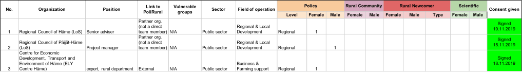 HÄME pilot has engaged 50 panel members. The members have been mapped according to the PoliRural standard procedure. The overall aim of stakeholder mapping is to identify actors interested and involved in collaborative policy development for rural areas and people within the framework of PoliRural project. As a result of the mapping (Table 1), a list of potential stakeholders and the way they are involved in PoliRural project activities must be prepared.