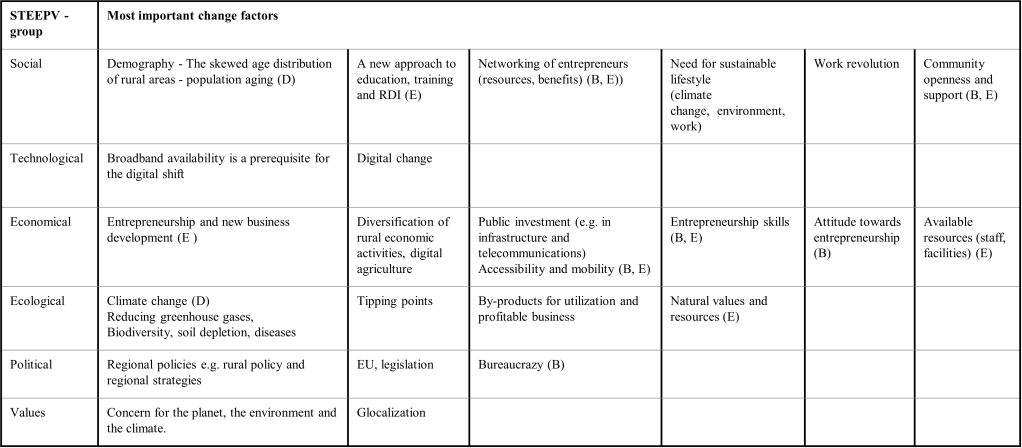 PoliRural partners have identified and described 64 Change Factors that are grouped in STEEPV-groups, that are Social-, Technological-, Economic-, Environmental-, Political-, and Value weighted change factors.