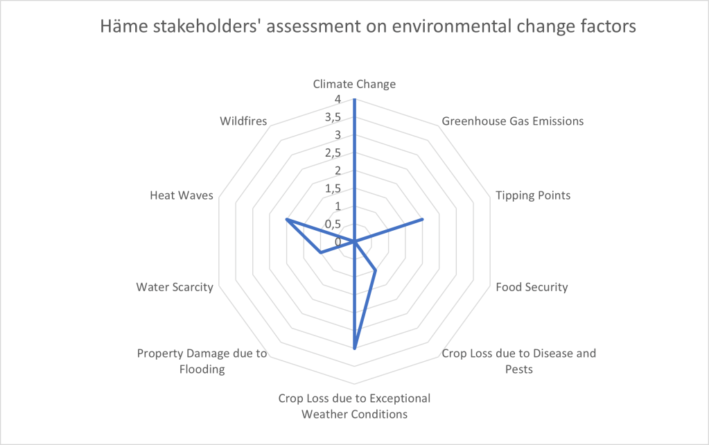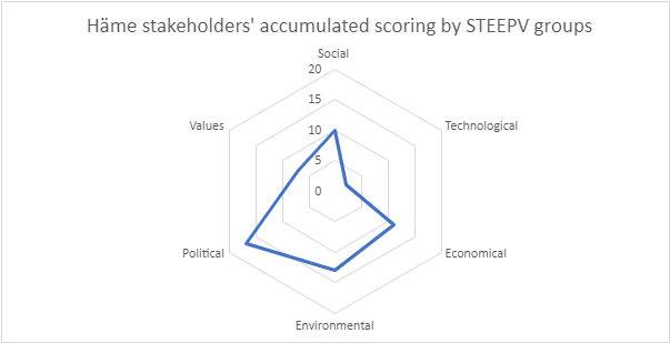 Häme stakeholders’ accumulated scoring by STEEPV groups is demonstrated in the below radar. The main outcome is that political and environmental change factors draw stakeholders’ attention. This result doesn’t mean that the other change factor has no meaning.