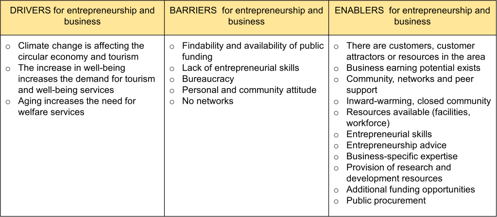 Häme pilot organized 12.3.2020 in Lepaa a workshop to identify drivers, enablers, and barriers that are assumed to have an impact on establishing new companies in Häme rural. The below table summarizes the results.