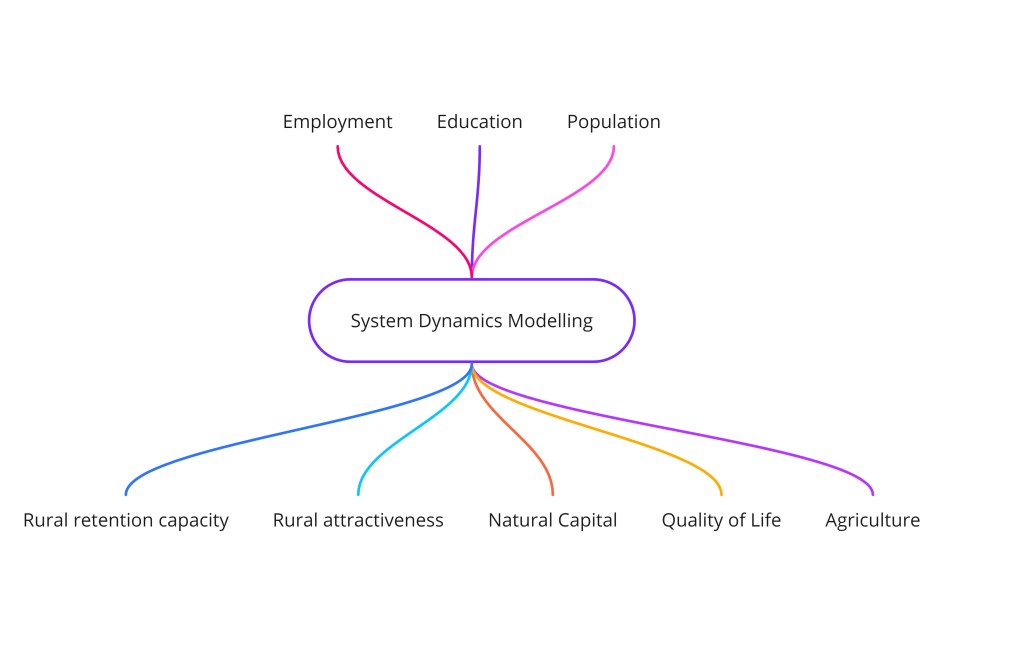 In terms of System Dynamics Modelling (SDM), the main dynamics are POPULATION, EMPLOYMENT, EDUCATION, AGRICULTURE, NATURAL CAPITAL, QUALITY OF LIFE, RURAL ATTRACTIVENESS AND RURAL RETENTION CAPACITY.
