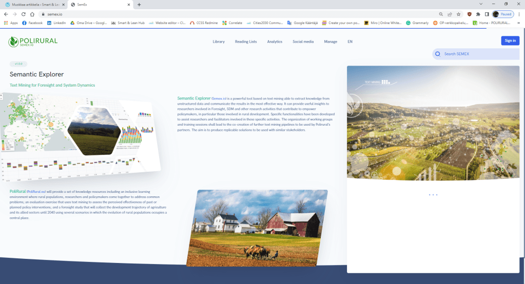 Semantic Explorer (www.semex.io) on tekstinlouhinnan työkalu, jonka avulla loppukäyttäjä voi analysoida ja visualisoida maaseudun kehittämiseen liittyvää tekstimuotoista dataa.